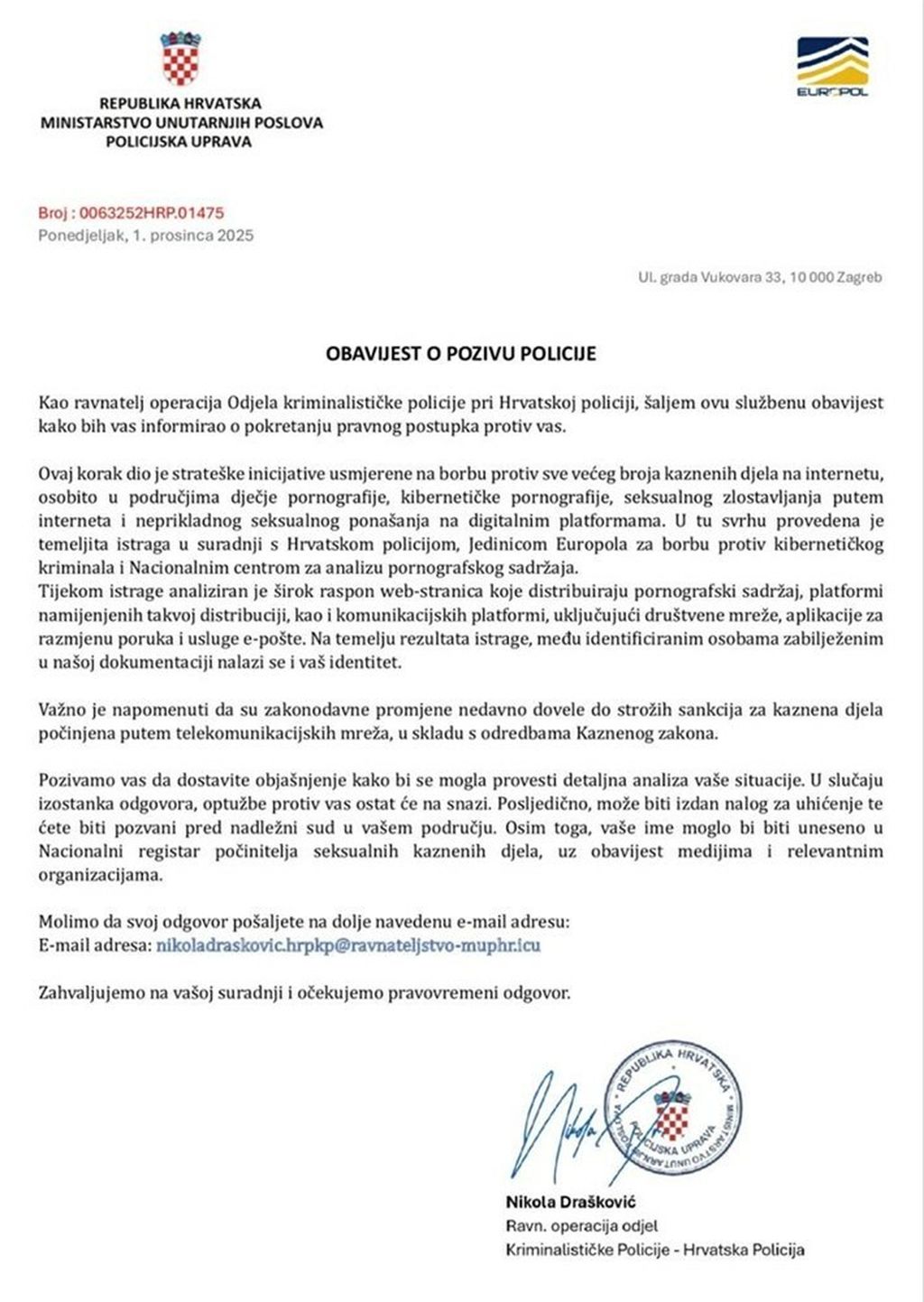 U poruci, koja sadrži i privitak, navodi se da ona dolazi do ravnatelja operacija Odjela kriminalističke policije te se primatelja poruke informira o pokretanju pravnog postupka protiv te osobe.