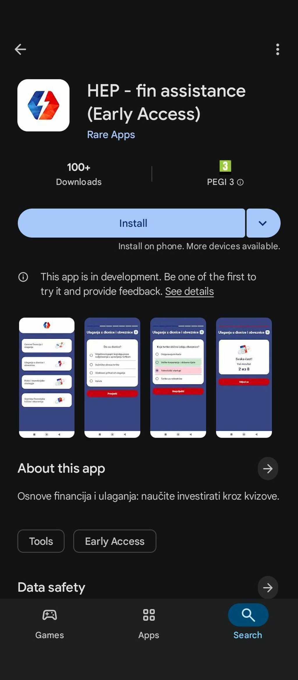 Prema opisu u Google Play trgovini radi se o aplikaciji koja je još u fazi razvoja i trebala bi korisnike naučiti o osnovama financija i ulaganja kroz kvizove.