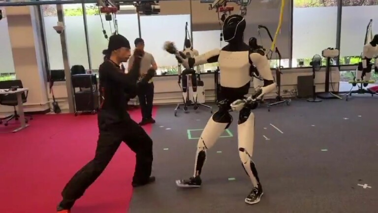 Kratki video snimljen u Teslinim prostorima, pokazuje Optimusa kako izvodi kung fu poteze u svojevrsnoj borbi s čovjekom.
